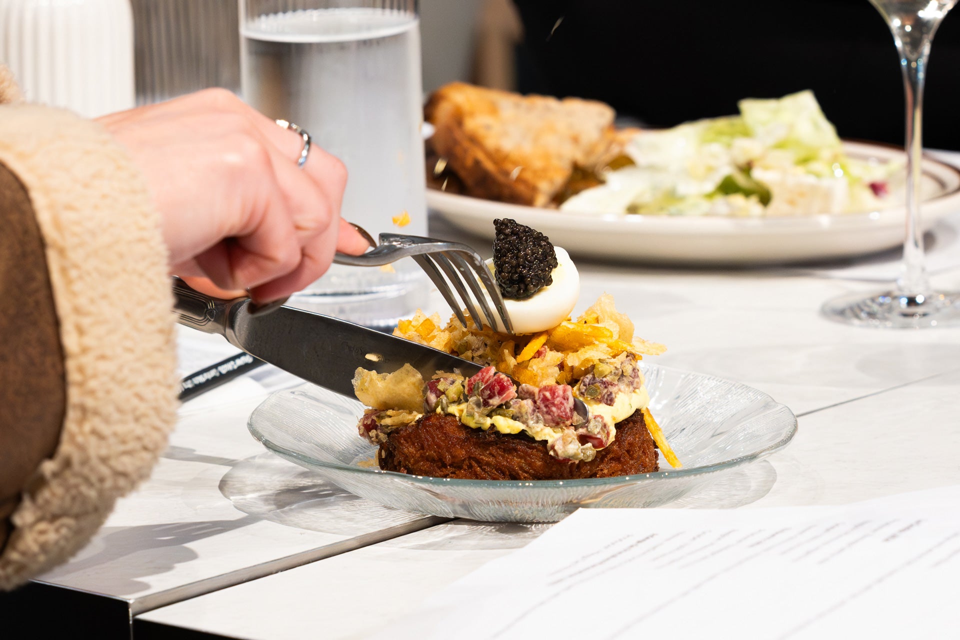 Petit latkah avec salade de poisson fumé et œufs de truite
