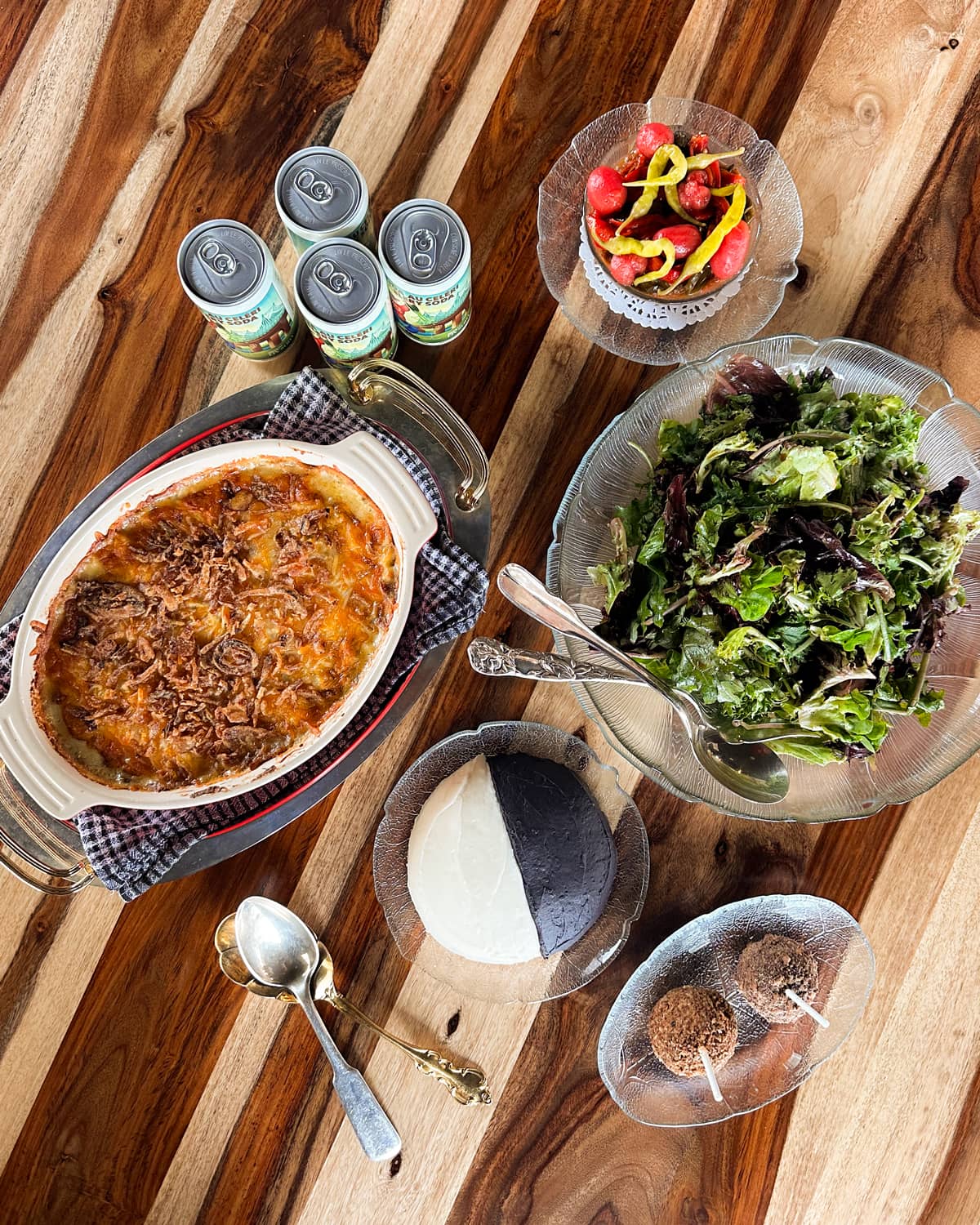 Le repas complet est servi avec notre zacusca (aubergines fumées aux poivrons et tomates rôtis et marinés), une salade verte et quatre sodas au céleri Yans Deli. Pour finir, nous avons ajouté notre grand cookie bicolore et deux cake pops du moment.