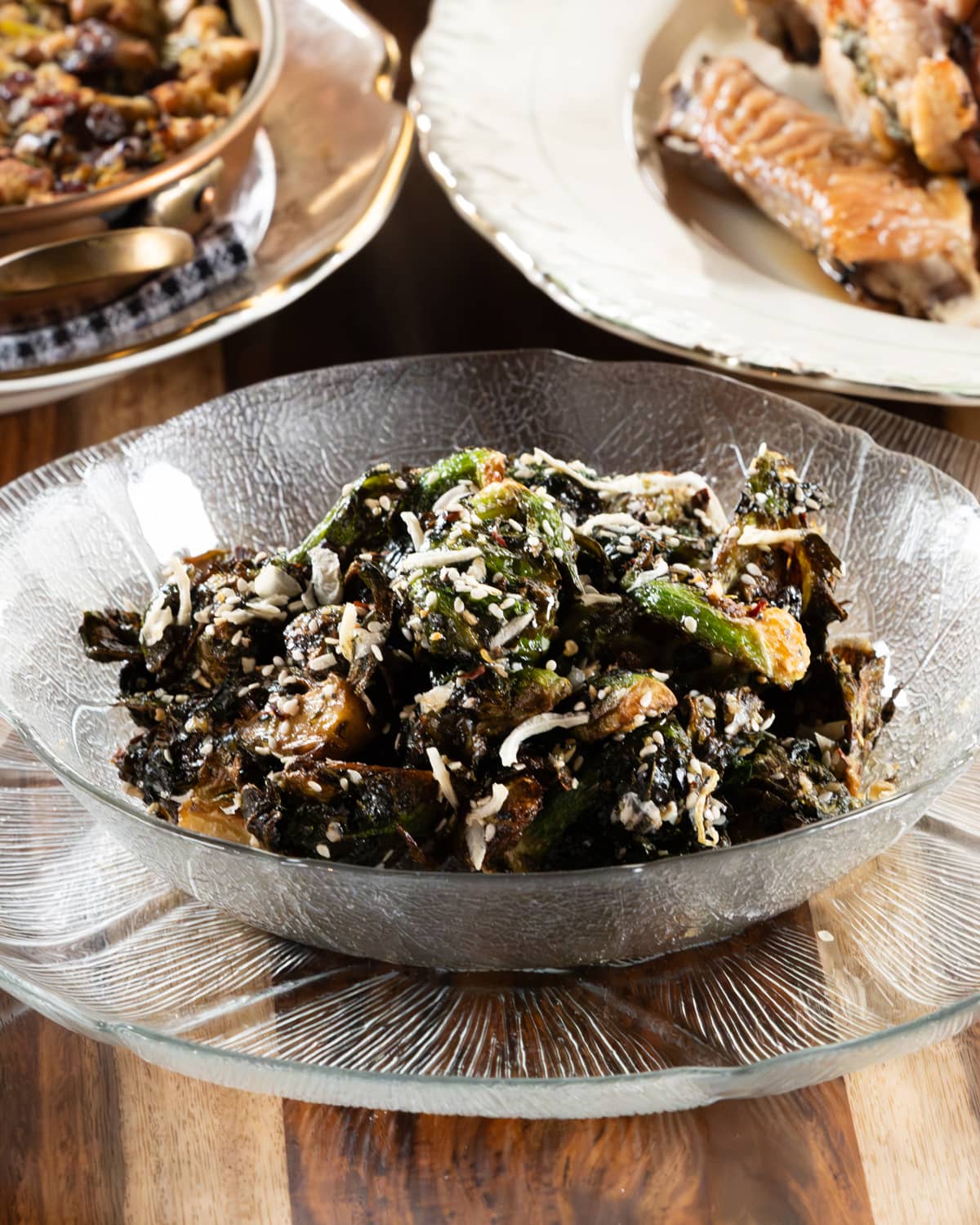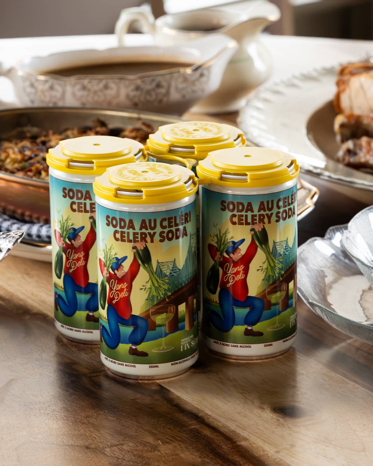 Deboned and brined turkey, bathed in an herb garlic butter and roasted. Served atop a chestnut and cranberry stuffing. Served with Brussel sprouts coated in honey and everything bagel spice. Green salad with our house vinaigrette. Cranberry sauce and a Madera-turkey gravy. For dessert a brown butter-sweet potato pie finished with maple syrup and roasted marshmallows. And 4 Yans Deli celery soda